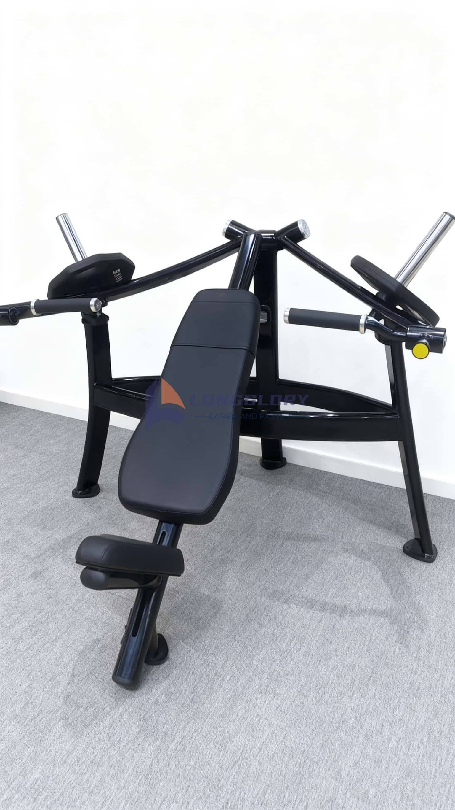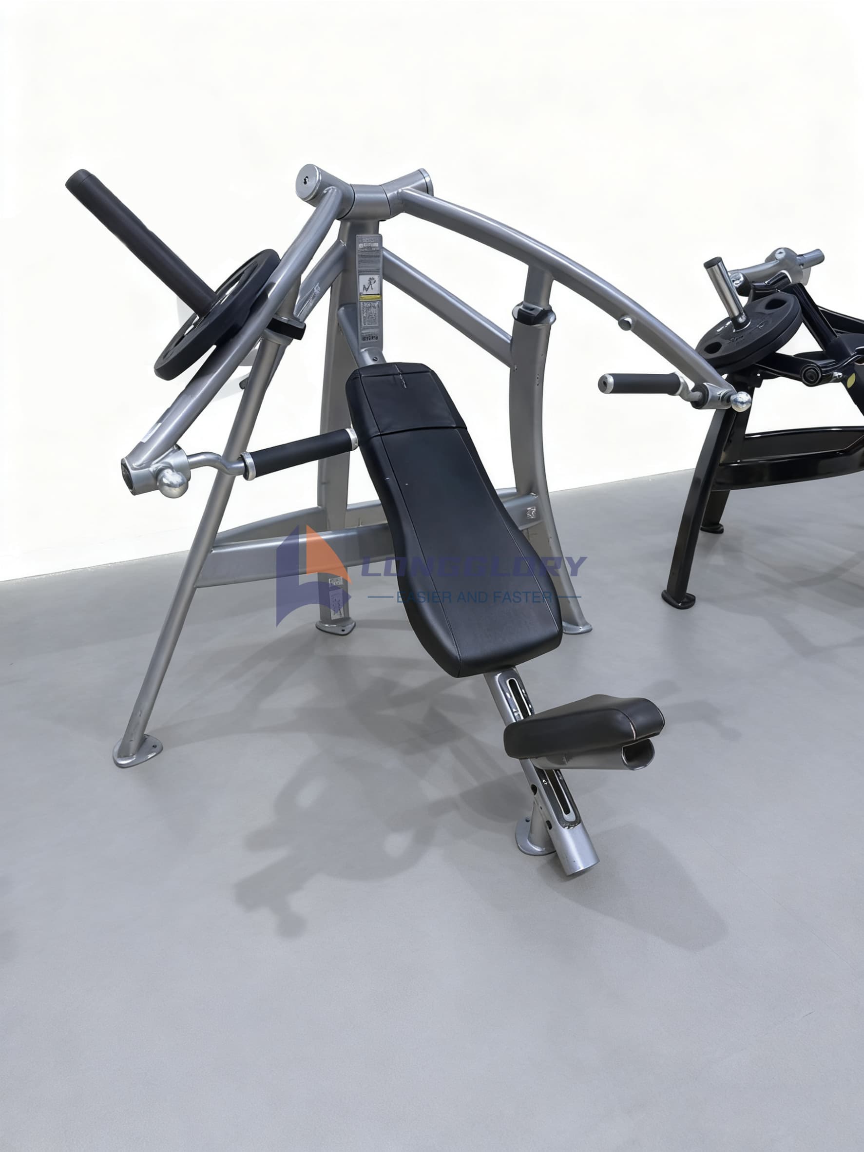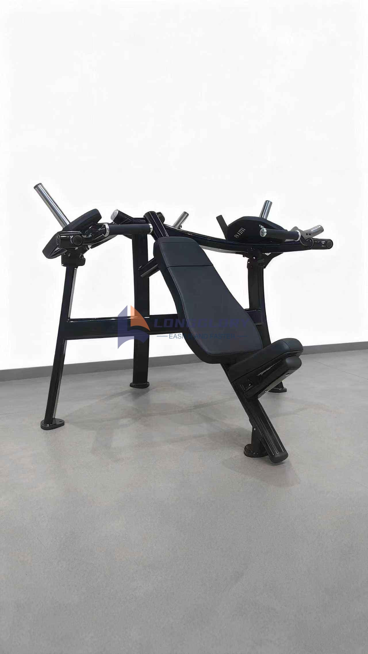 商用インクラインチェストプレスは、高頻度の商用使用下でも長期にわたる耐久性と安定性を確保するために、頑丈なスチールフレームで作られています。人間工学に基づいたインクライン角度により、フラットプレス動作よりも効率的に大胸筋上部を活性化できるため、コマーシャルインクラインチェストプレスは、商業ジムでの胸部筋力トレーニングに不可欠なマシンとなっています。